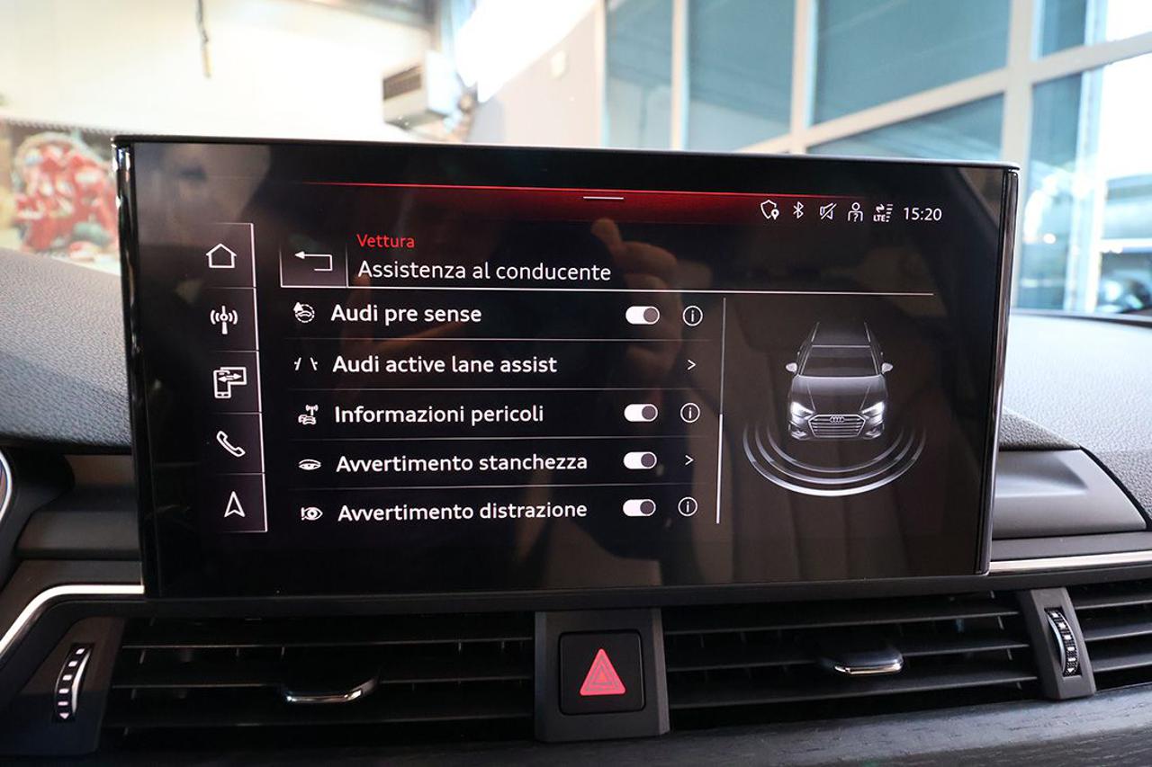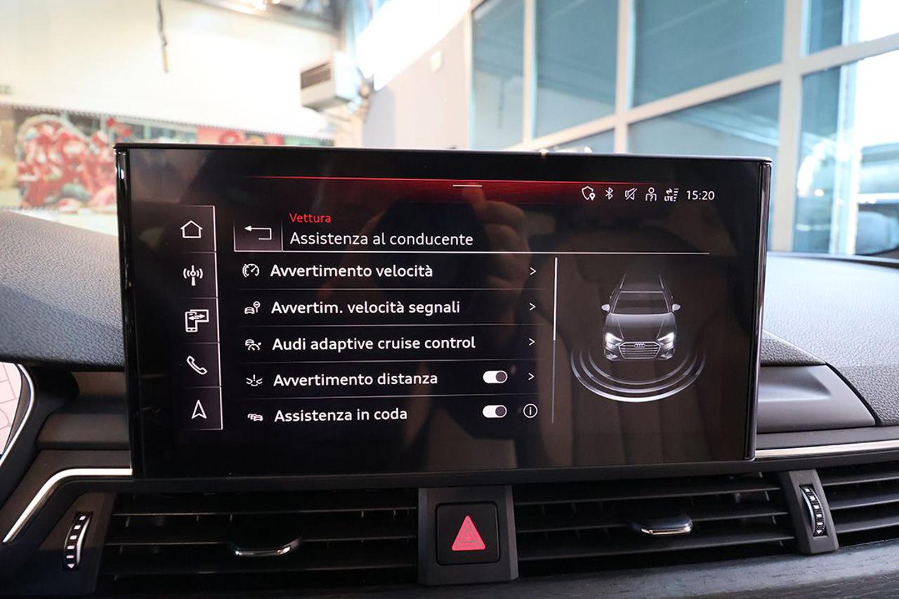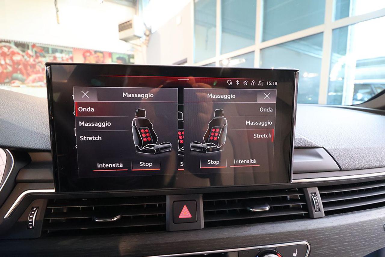 Cambio automatico S-Tronic Adaptive Cruise Control Assistente al parcheggio Assistenza alla partenza Audi Active Lane Assist Audi connect Navigation & Infotainment plus Audi Drive Select Audi Pre-Sense Audi Smartphone Interface Audi Sound System Audi Virtual Cockpit plus Bracciolo centrale anteriore comfort Bracciolo posteriore con dispositivo per il carico passante Cerchi in lega Audi Sport 19" a 5 razze doppie con inserti in grigio opaco Chiave comfort con sbloccaggio portellone vano bagagli tramite sensori Chiusura di sicurezza per bambini ad azionamento elettrico Cielo in tessuto Nero Climatizzatore automatico comfort a 3 zone Collision Avoid Assist Dispositivo di assistenza per proiettori abbaglianti Elementi interni in ecopelle Impianto Bluetooth Ingresso USB Inserti in rovere grigio naturale Lavafari Mancorrenti cromati al tetto Maniglie esterne delle portiere cromate Navigatore satellitare MMI Plus con MMI Touch Pacchetto assistenza Tour Pacchetto look alluminio esterno Pacchetto luci ambiente e profilo, multicolore Portellone vano bagagli ad apertura e chiusura elettrica Prese USB (2) al posteriore Proiettori a LED Audi Matrix con gruppi ottici posteriori a LED Radio digitale DAB Retrovisori esterni ed interno autoanabbaglianti Retrovisori esterni ripiegabili elettricamente e riscaldabili con funzione Memory Riconoscimento della segnaletica stradale Ruota di scorta ripiegabile con compressore Sedili anteriori regolabili elettricamente con funzione Memory Sedili anteriori riscaldabili elettricamente Sedili sportivi Sensore luci Sensore pioggia Sistema di ausilio al parcheggio plus, anteriore e posteriore Sistema di controllo pressione pneumatici Sistema di controllo velocità in discesa Sistema Isofix al sedile passeggero anteriore Sistema Isofix con disattivazione airbag passeggero Sistema per la chiamata di emergenza Specchietti di cortesia illuminati Streaming audio Bluetooth Supporto lombare con regolazione pneumatica e funzione massaggio Telecamera posteriore Telecamere a 360° Traffic Jam Assist Turn Assist Verniciatura a contrasto Vetri posteriori e lunotto oscurati Voice control Volante sportivo multifunzione plus con bilanceri