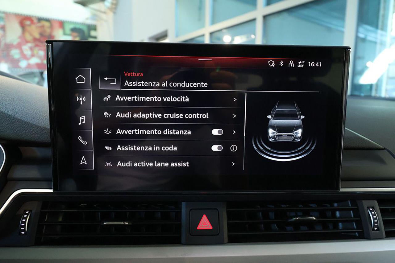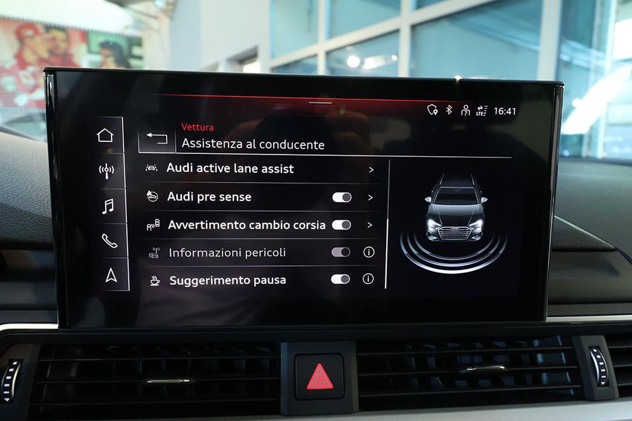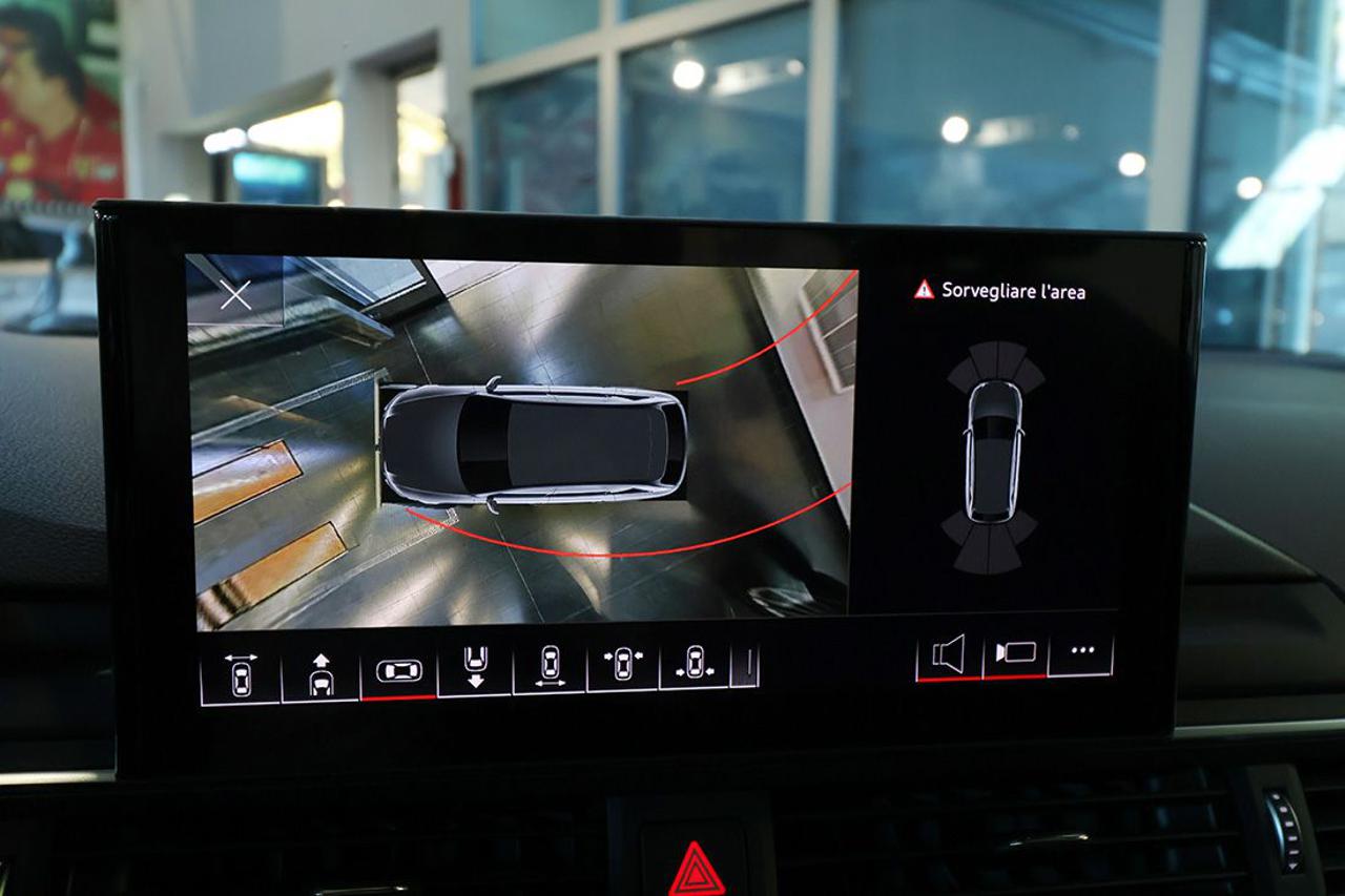 Cambio automatico S-Tronic Adaptive Cruise Control Appoggiabraccia centrale anteriore comfort Assetto sportivo Assistente al parcheggio Audi Active Lane Assist Audi Side Assist con Audi Pre Sense rear Audi Virtual Cockpit plus Audi connect Navigation & Infotainment plus Audi Drive Select Audi Phone Box Audi Pre-Sense Audi Smartphone Interface Audi Sound System Bracciolo posteriore con dispositivo per il carico passante Bulloni antifurto Cerchi in lega 18" a 5 razze doppie a stella Climatizzatore automatico Comfort a 3 zone Collision Avoid Assist Dispositivo di assistenza per proiettori abbaglianti Exit Warning Head-Up Display Impianto Bluetooth Ingresso USB Listelli sottoporta anteriori in alluminio con logo S, illuminati Mancorrenti cromati al tetto Navigatore satellitare MMI Plus con MMI Touch Pacchetto assistenza City Pacchetto assistenza Tour Pacchetto esterno lucido Pacchetto luci ambiente e profilo multicolore Pacchetto S-Line exterior Portellone vano bagagli ad apertura/chiusura elettrica Prese USB (2) al posteriore Proiettori Full LED con gruppi ottici posteriori a LED Radio digitale DAB Rear Cross Traffic Alert Retrovisori esterni ed interno autoanabbaglianti Retrovisori esterni ripiegabili elettricamente e riscaldabili Riconoscimento della segnaletica stradale Sedili sportivi Sensore luci Sensore pioggia Sistema di ausilio al parcheggio plus, anteriore e posteriore Sistema di controllo pressione pneumatici Sistema Isofix con disattivazione airbag passeggero Sistema per la chiamata di emergenza Specchietti di cortesia illuminati Streaming audio Bluetooth Supporto lombare elettrico Telecamera posteriore Telecamere a 360° Traffic Jam Assist Turn Assist Voice control Volante sportivo multifunzione plus con bilanceri