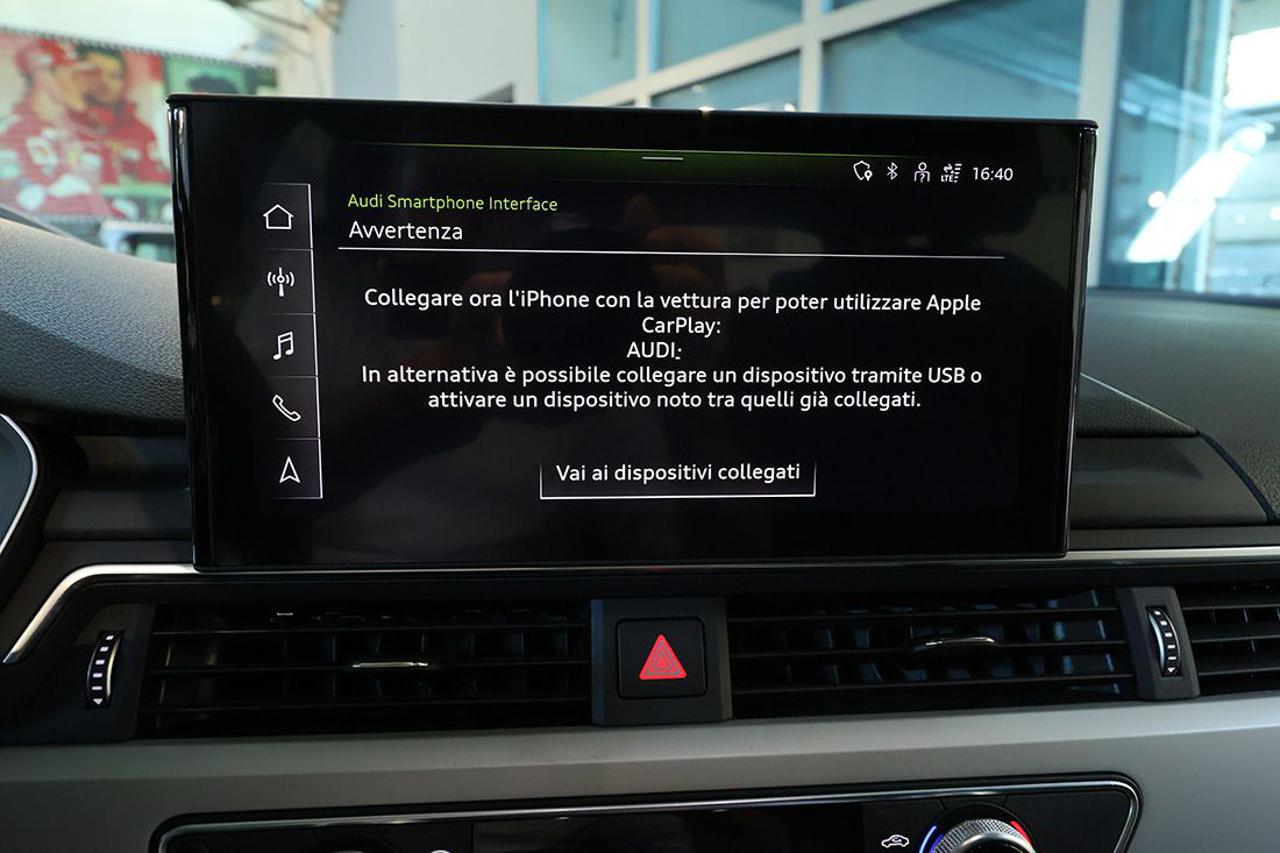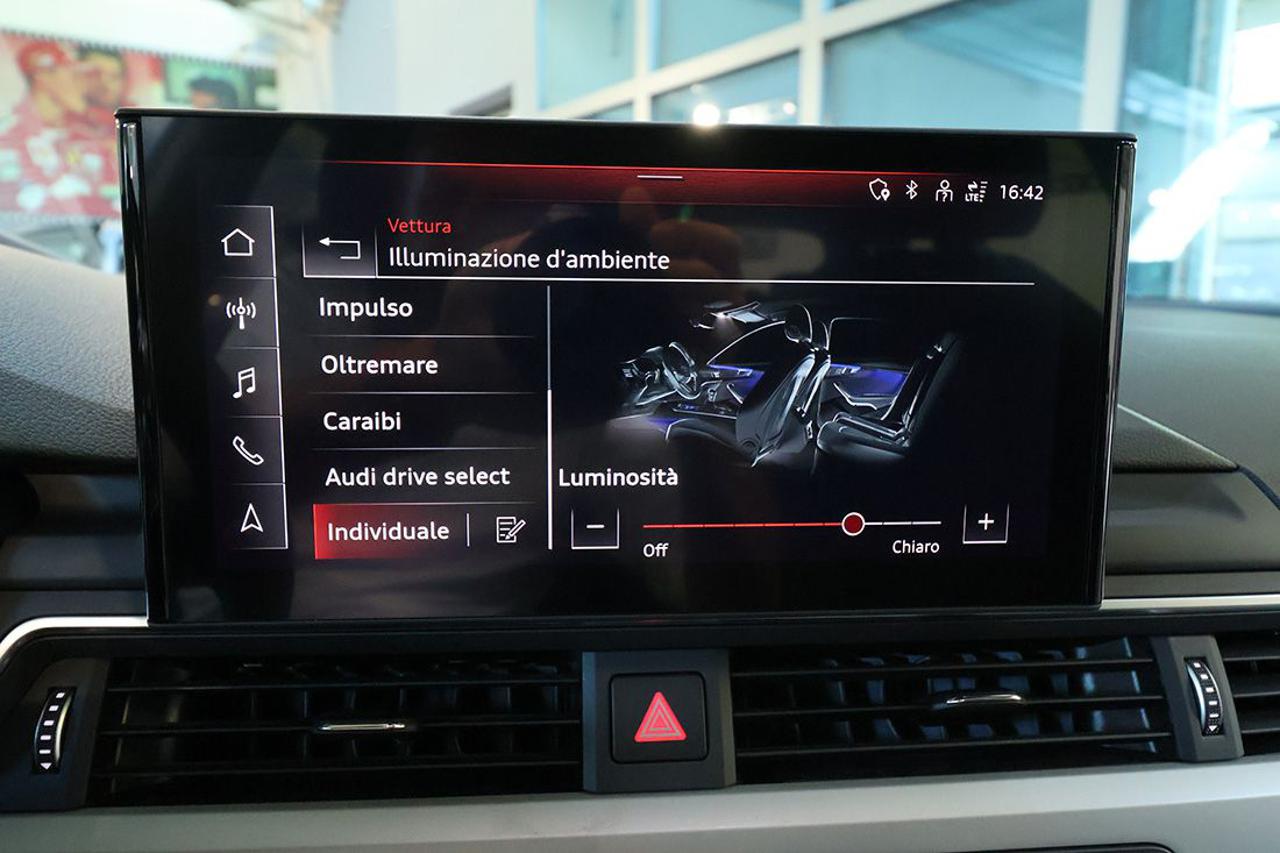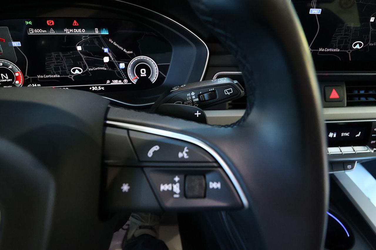 Cambio automatico S-Tronic Adaptive Cruise Control Appoggiabraccia centrale anteriore comfort Assetto sportivo Assistente al parcheggio Audi Active Lane Assist Audi Side Assist con Audi Pre Sense rear Audi Virtual Cockpit plus Audi connect Navigation & Infotainment plus Audi Drive Select Audi Phone Box Audi Pre-Sense Audi Smartphone Interface Audi Sound System Bracciolo posteriore con dispositivo per il carico passante Bulloni antifurto Cerchi in lega 18" a 5 razze doppie a stella Climatizzatore automatico Comfort a 3 zone Collision Avoid Assist Dispositivo di assistenza per proiettori abbaglianti Exit Warning Head-Up Display Impianto Bluetooth Ingresso USB Listelli sottoporta anteriori in alluminio con logo S, illuminati Mancorrenti cromati al tetto Navigatore satellitare MMI Plus con MMI Touch Pacchetto assistenza City Pacchetto assistenza Tour Pacchetto esterno lucido Pacchetto luci ambiente e profilo multicolore Pacchetto S-Line exterior Portellone vano bagagli ad apertura/chiusura elettrica Prese USB (2) al posteriore Proiettori Full LED con gruppi ottici posteriori a LED Radio digitale DAB Rear Cross Traffic Alert Retrovisori esterni ed interno autoanabbaglianti Retrovisori esterni ripiegabili elettricamente e riscaldabili Riconoscimento della segnaletica stradale Sedili sportivi Sensore luci Sensore pioggia Sistema di ausilio al parcheggio plus, anteriore e posteriore Sistema di controllo pressione pneumatici Sistema Isofix con disattivazione airbag passeggero Sistema per la chiamata di emergenza Specchietti di cortesia illuminati Streaming audio Bluetooth Supporto lombare elettrico Telecamera posteriore Telecamere a 360° Traffic Jam Assist Turn Assist Voice control Volante sportivo multifunzione plus con bilanceri