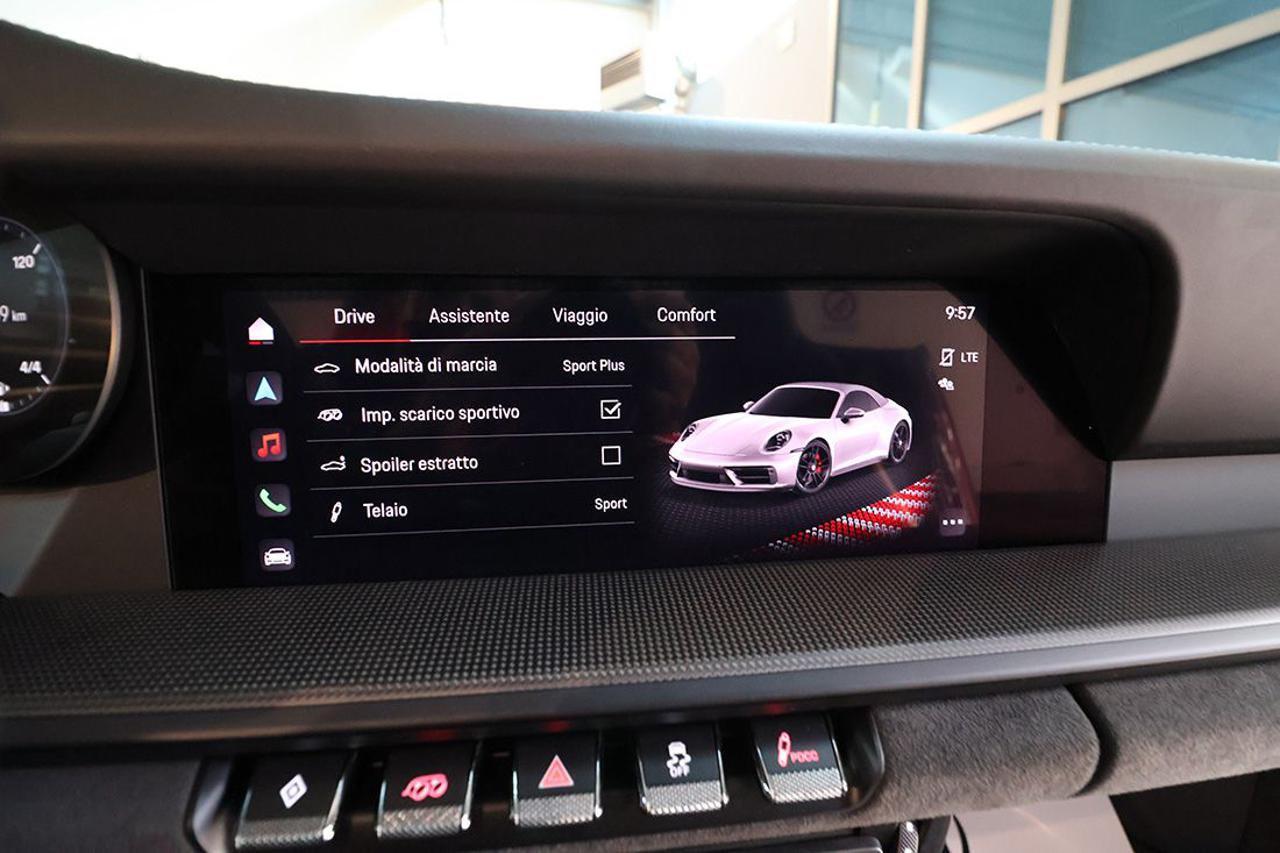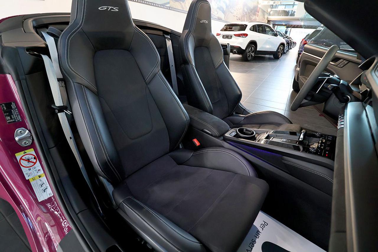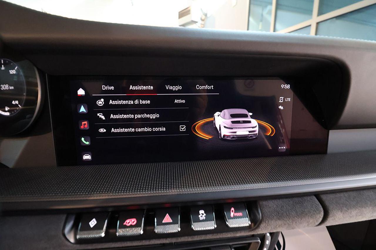 Adaptive Cruise Control Asse posteriore sterzante BOSE Surround Sound System Composto sigillante per pneumatici e compressore d'aria elettrico Fari principali a LED con tecnologia Matrix, scuri, incl. Porsche Dynamic Light System Plus Fari posteriori Exclusive Fascia grigia sulla parte superiore del parabrezza Lane Change Assist Listelli sottoporta in carbonio opaco, illuminati Luci di cortesia a LED sulle portre con logo PORSCHE Minigonne laterali SportDesign verniciate in nero (opaco) Pacchetto interni GTS Pacchetto interni in carbonio opaco Pacchetto Light Design Pinze freno verniciate in nero lucido Porsche Dynamic Chassis Control (PDCC) Porsche Entry Quadrante strumentazione in color gesso Riscaldamento dei sedili anteriori Schienale sedili sportivi Plus in pelle con inserto decorativo in carbonio opaco Sedili sportivi adattivi Plus, elettrici a 18 vie, con pacchetto Memory Serbatoio da 90 litri Servosterzo Plus Specchietti esterni ripiegabili elettricamente inclusa illuminazione di cortesia Specchietti retrovisori esterni ed interno con antiabbagliante automatico e sensore pioggia integrato Stemma Porsche sul coperchio del vano portaoggetti in Race-Tex Tappo serbatoio Exclusive Design Volante sportivo GT riscaldabile in Race-Tex con finiture in carbonio opaco